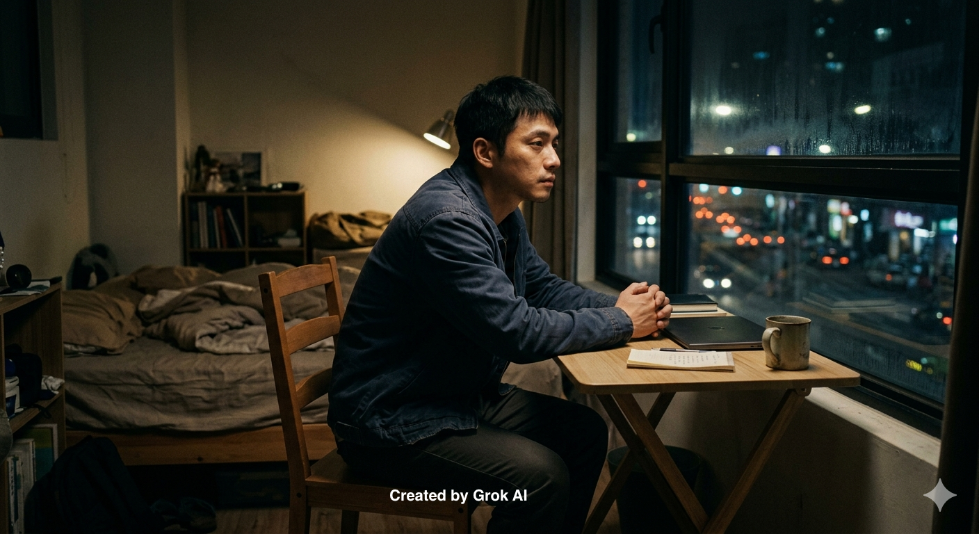 他離開那個家很早。那個家裡總是有聲音——門被用力關上的聲音、情緒突然升高的聲音、以及那種還沒爆發、卻讓人整晚睡不著的安靜。他很早就學會一件事,不要讓自己回去。所以他讀書、考試、找工作,一路往外走。他不覺得自己在追求什麼,只是很清楚,不能掉回去。